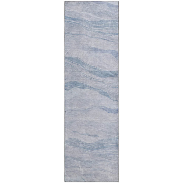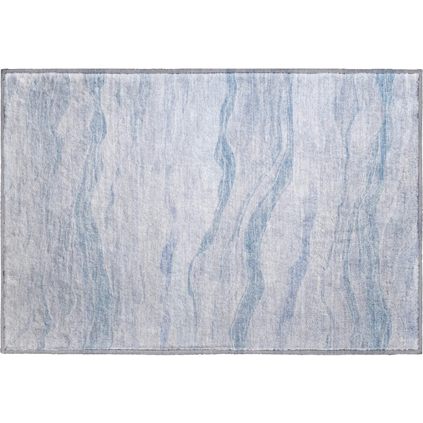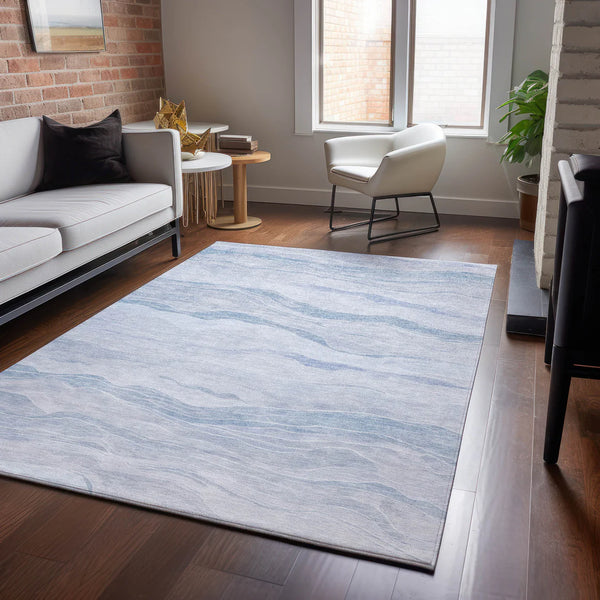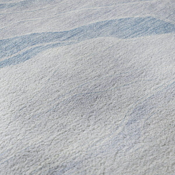 Soft, undulating waves flow gently across the surface in shades of sky, blue, and denim, evoking the tranquil movement of ocean tides and the calm of a clear seaside horizon. This airy palette creates an atmosphere of coastal relaxation, pairing beautifully with white, driftwood, and sand-colored décor. The result is a rug that feels as refreshing as a sea breeze—simple, elegant, and endlessly versatile.